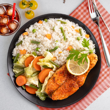 Our Cajun Grilled 1/2 Chicken is marinated in an authentic blend of Cajun spices and garlic, ensuring every bite is bursting with bold, savory flavors and perfectly grilled, It is served with your choice of two side dishes and one refreshing drink.