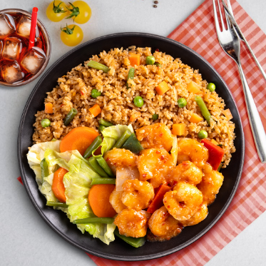 Crispy chicken tossed in a tangy and sweet orange sauce, bursting with citrus flavor. A delicious balance of savory and zesty flavors served with your choice of two side dishes and one refreshing drink.