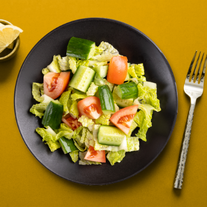 A fresh mix of crisp lettuce, tomatoes, cucumbers, and carrots, perfect as a light and healthy side.