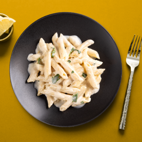 Penne pasta delicately dressed in butter and cream, garnished with fresh parsley for a creamy and flavorful dish.